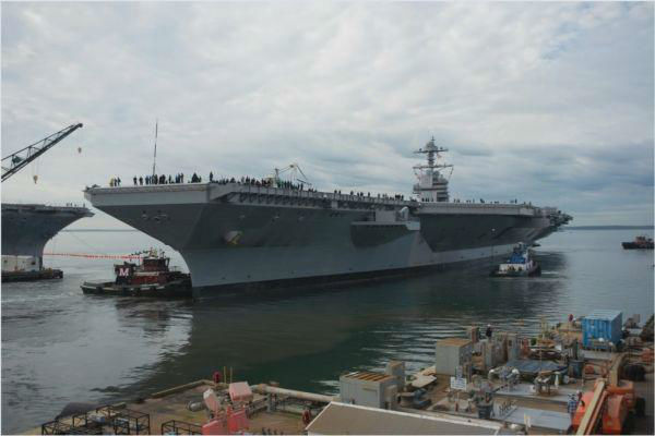 美海軍“福特”號航母25日離開位于弗吉尼亞州的紐波特紐斯造船廠,進行新一輪海試。(美國海軍網站)